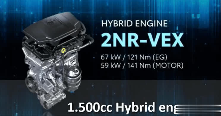 根据泰媒披露的信息,Yaris ATIV Hybrid所搭载的混动系统,与此前已在泰国市场推出的Yaris Cross Hybrid基本相同,只是在调校细节上略有差别。其核心是一台编号为2NR-VEX的1.5升自然吸气引擎,排量为1496cc。该引擎采用四缸DOHC结构,缸径与行程为72.5mmx90.6mm,压缩比高达11.5:1,单独输出能产生约91PS、峰值扭矩121Nm。在与一台最大功率80PS、峰值扭矩141Nm的电机联手后,系统综合功率可达到111PS,并通过e-CVT无级变速箱将动力传递到前轮。混动电池为一块容量约0.7kWh的锂离子电池,官方测试支持使用E20生物燃油。